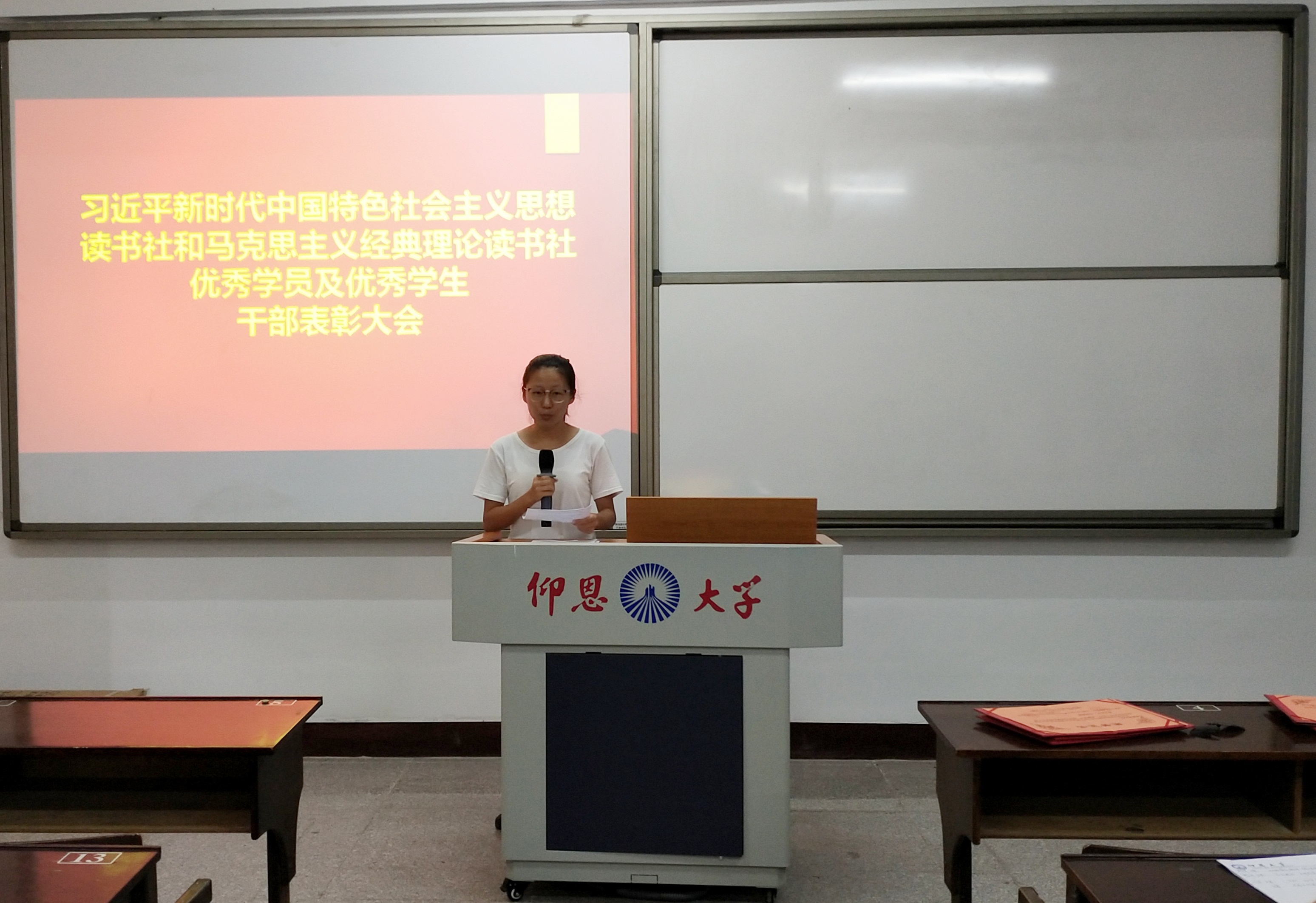 习近平新时代中国特色社会主义思想读书社指导教师高灿宣读表彰文件,此次表彰大会表彰了习近平新时代中国特色社会主义思想读书社和马克思主义经典理论读书社两个读书社的优秀学员及优秀学生干部。结合社员学期表现、报告撰写情况及教师评价,两个读书社共表彰了26位优秀学员和6位优秀学生干部。马克思主义经典理论读书社社长、优秀学生干部欧敏敏代表发言,她以亲身的经历向在座的师生讲述了自己参加读书社前后思想及心理上的成长及蜕变。