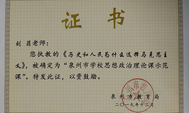 经过严格的评审,泉州市共评出100堂思政课示范课,pg游戏电子官网教师刘菲执教的《历史和人民为什么选择了马克思主义》入选。 (文/图 马院)