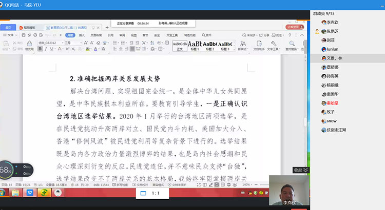 之后,学院教师基于教学要点进行了“形势与政策”课的教学研讨。李克钦提出,在“形势与政策”课教学中要把怎样贯彻文件精神作为教学工作的重中之重,他指出要将文件提到的内容有针对性地融入到教学专题中去。“形势与政策”课程负责人袁国华老师指出,教材选定的几个专题和教育部制定的要点是相对应的,完全可以通过作业的形式或采用延伸阅读的方式加入到现在授课的专题中去。孙海英老师分享她上课的经验,提出要运用抗疫专题的内容展开教学,用中国抗疫成功的经验讲家国情怀、讲中美关系、讲经济形势、讲全面小康等。