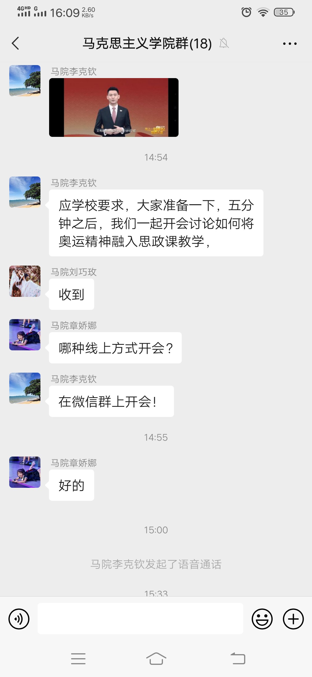 李克钦书记总结指出,如何将奥运精神融入思政课,可以将身边的事件以案例的方式融入教学,以增强教学效果、增加学生的认同感。同时,也希望各位老师在此后的工作生活中,也要继承发扬奥运精神,现在疫情期间线上教学,也希望各位老师拿出奥运健儿们的那种拼搏精神,备好课、教好学。 (文图/马院)