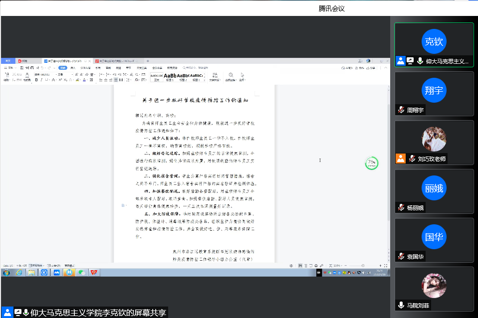 李克钦首先对近期学校的疫情防控情况进行通告,并向各位教师传达了泉州市洛江区教育系统新冠疫情防控工作领导小组办公室所印发的《关于进一步抓好学校疫情防控工作的通知》。《通知》明确了学校要减少人员流动、做好登记追踪、强化宿舍管理、加强餐饮配送、加大防疫保障等工作安排。李克钦强调,学院教师要遵守学校的疫情防控规定,外出必须全程戴口罩和手套,不与人接触,减少交流,坚决不扎堆,不聚集。同时,他还指出,教师为人师表,要为学生树立榜样,特殊时期必须服从学校的工作安排,尊重医护人员和志愿者们的辛苦付出。