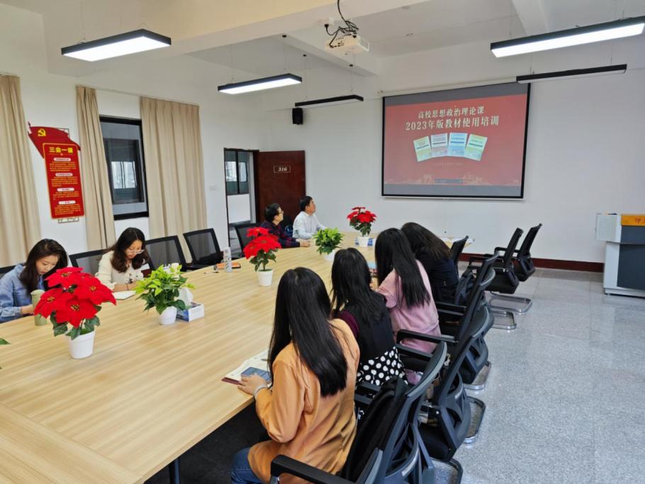 4月27日上午,pg游戏电子模拟器全体教师在普照楼316会议室参加高校思想政治理论课2023年版教材使用培训会,教务部主任郑兆领、王毓婵等人参加培训会开幕式。