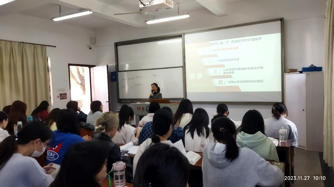 杨老师讲授的内容是《商品价值和价值规律》,这是《马克思主义基本原理》的重要内容之一。杨老师首先请学生上台分享“构建统一大市场”的感悟,随后,她以莫泊桑的《项链》为切入点,深入浅出地讲述了商品价值量的决定因素、价值形式的发展与货币的产生等内容。期间,杨老师不仅运用了鲜活的历史与现实案例,如“8亿件衬衫换1架飞机”“北京人社局副处长体验送外卖”,来说明商品价值量同简单劳动与复杂劳动的密切关系,而且还与同学们进行了亲切的互动,鼓励他们提出问题和发表看法,激发了他们的学习兴趣和思维活力。