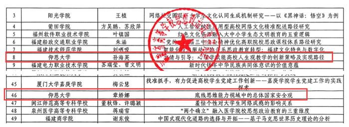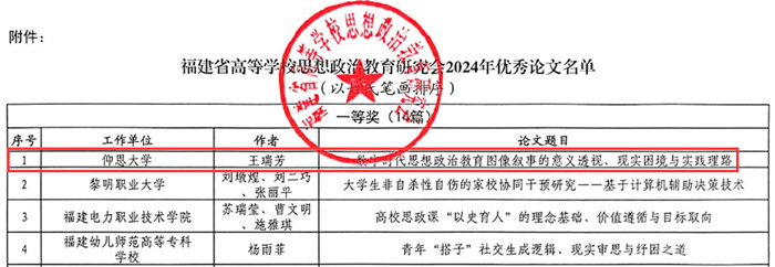 近日,福建省高等学校思想政治教育研究会发布了《关于表彰福建省高等学校思想政治教育研究会2024年优秀论文的通知》,pg游戏电子官网选送的3篇论文均获奖。其中,王瑞芳老师撰写的《数字时代思想政治教育图像叙事的意义透视、现实困境与实践理路》获一等奖,在所有一等奖获奖论文中位列第一。孙海英老师撰写的《共情与引导:心理学赋能高校人生观教学的创新策略及实现路径》和章娇娜老师撰写的《底线思维能力视域中的总体国家安全观》获优秀奖。