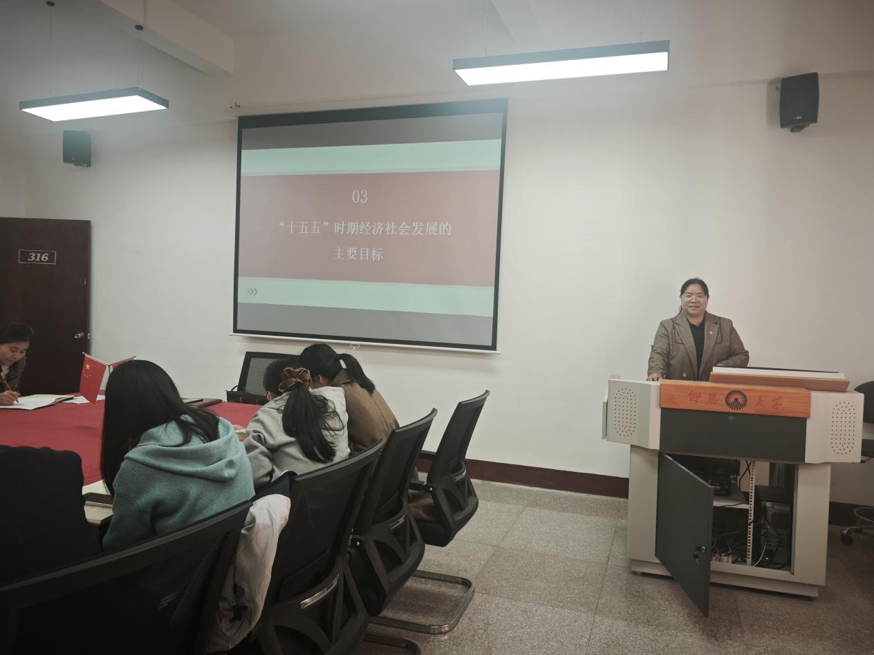 同时,章娇娜对“十五五”时期经济社会发展的主要目标进行了详细讲解,结合理论与实际,分析了新时期的发展任务与战略指向。她指出,深刻理解和把握这些原则与目标,对于学院全体教师提升理论素养、找准教学科研的着力点具有重要指导意义。